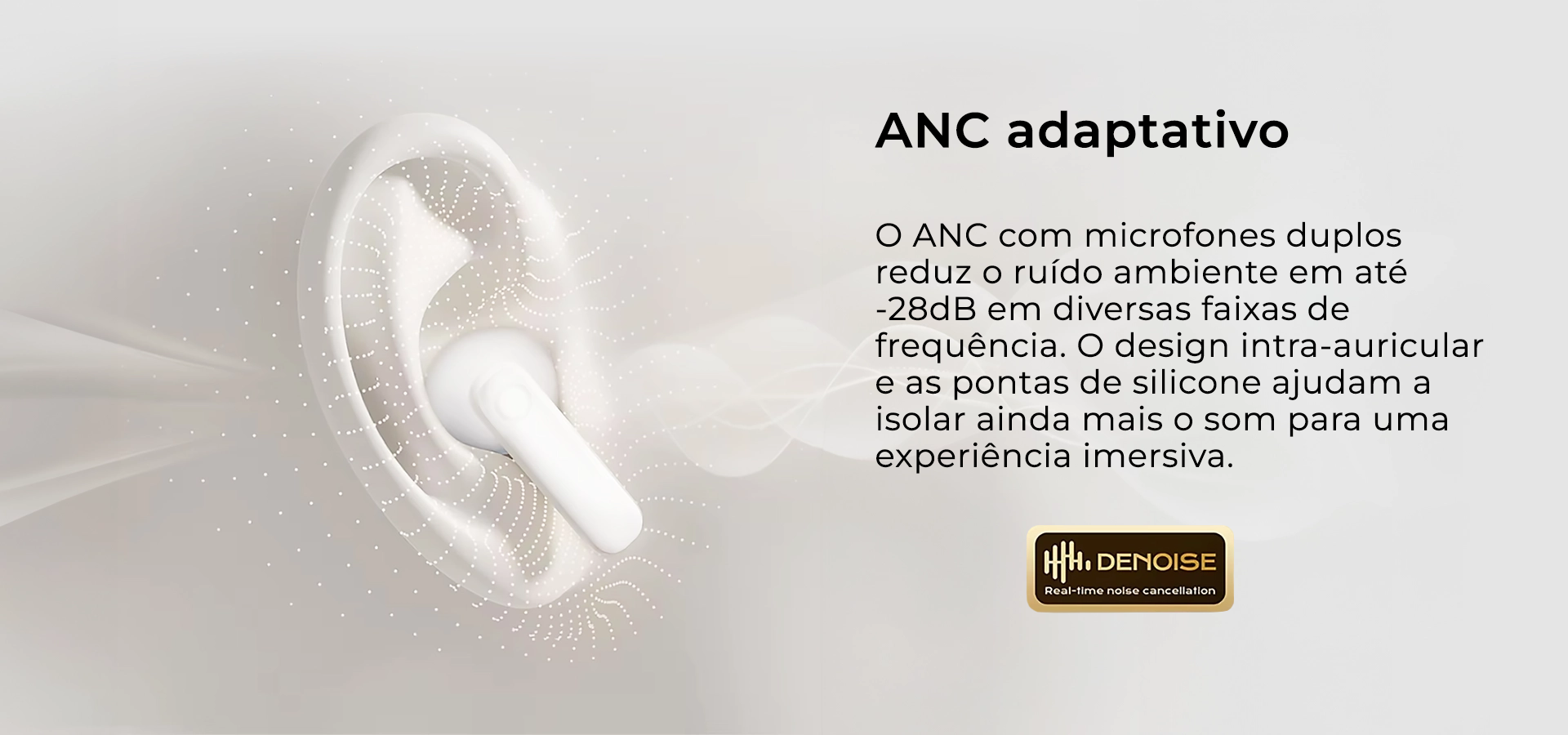 Quatro microfones de alta sensibilidade e um algoritmo ENC filtram ruídos externos, garantindo que sua voz seja ouvida com clareza mesmo em ambientes barulhentos.