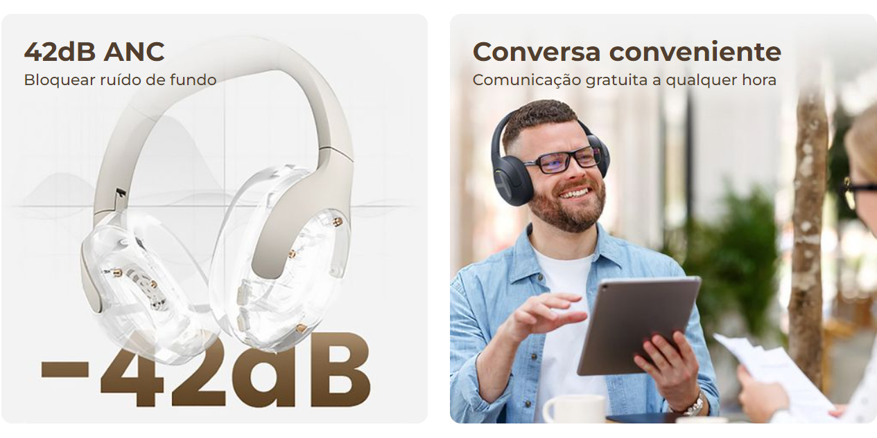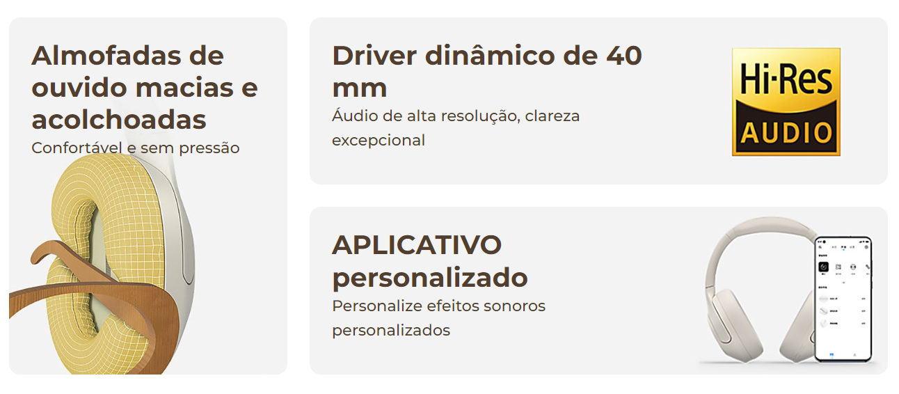dinâmicos de 40 mm e áudio Hi-Res. A tecnologia Hybrid Active Noise Cancelling