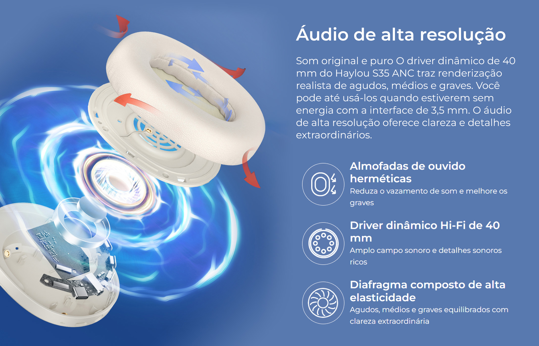 da máxima qualidade de áudio com os Haylou S35 ANC, equipados com alto-falantes