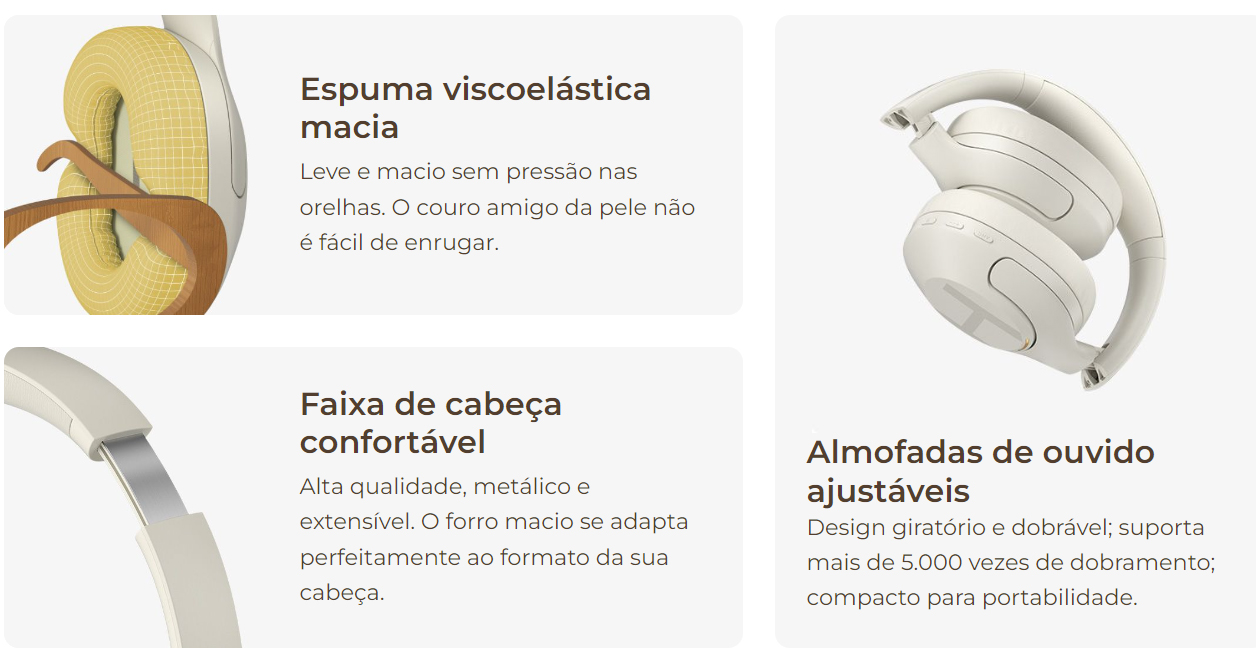A duração da bateria de 60 horas permite reprodução sem fio completa durante todo o dia. Carregue-se convenientemente com uma interface Type-C. O design dobrável facilita o armazenamento e o transporte para qualquer lugar.