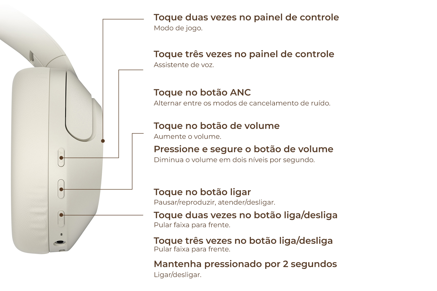controles intuitivos integrados, ajuste o volume, atenda chamadas, acione o ANC